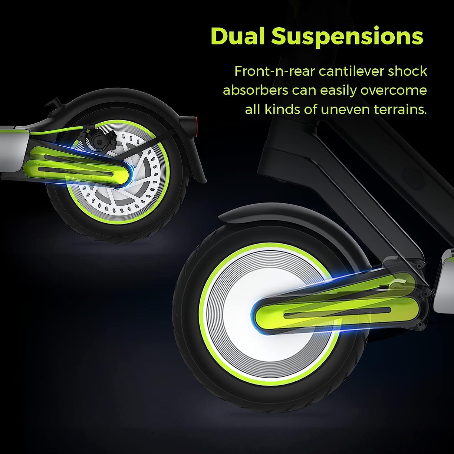 - 🛴【Dual Suspension System】:NAVEE Electric Scooter S65 is engineered with advanced front and rear dual suspension system to deliver unmatched comfort and stability on any terrain. Whether you’re riding on rough roads, uneven pavements, or bumpy trails, the S65 will provide you with a smooth and comfortable riding experience.